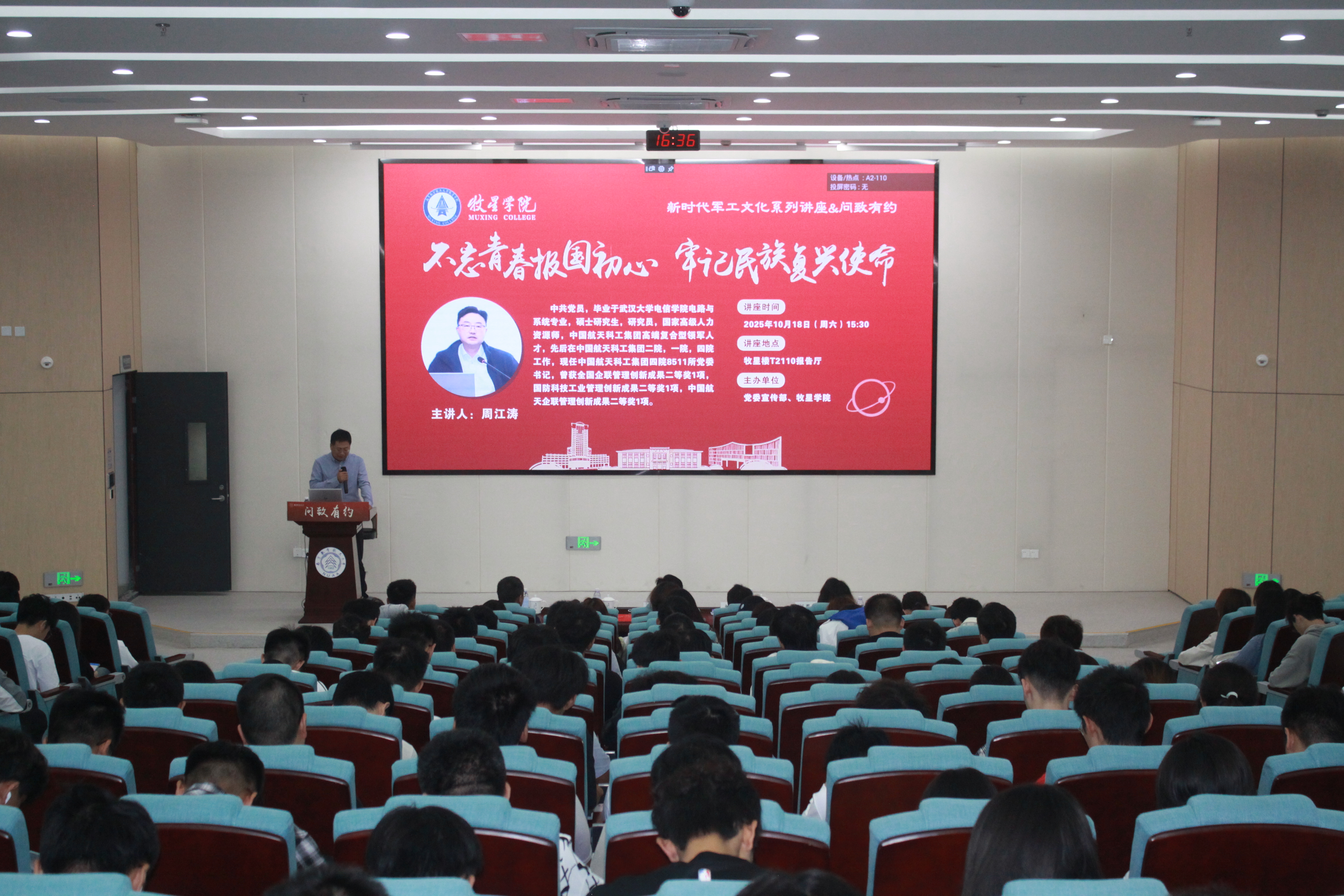 周江涛通过提出“时代三问”引导青年思考自身并对标先辈,查找差距;从外交部短片《正道》引入航天发展历史,回顾了中国航天与南航事业同源的奋斗历程,以“两弹一星”、北斗组网等成就及叶培建院士的事迹,带领同学们感悟航天系列精神,激励青年循正道、担使命,投身中国式现代化实践,并指出中国式现代化是强国建设、民族复兴的唯一正确道路;他从“立鸿鹄志、砺栋梁材、经风雨事、修平常心”四方面寄语青年成长,以航天精神铸就信念,以复兴大任砥砺担当,在时代的浪潮中,不负韶华,不负时代。