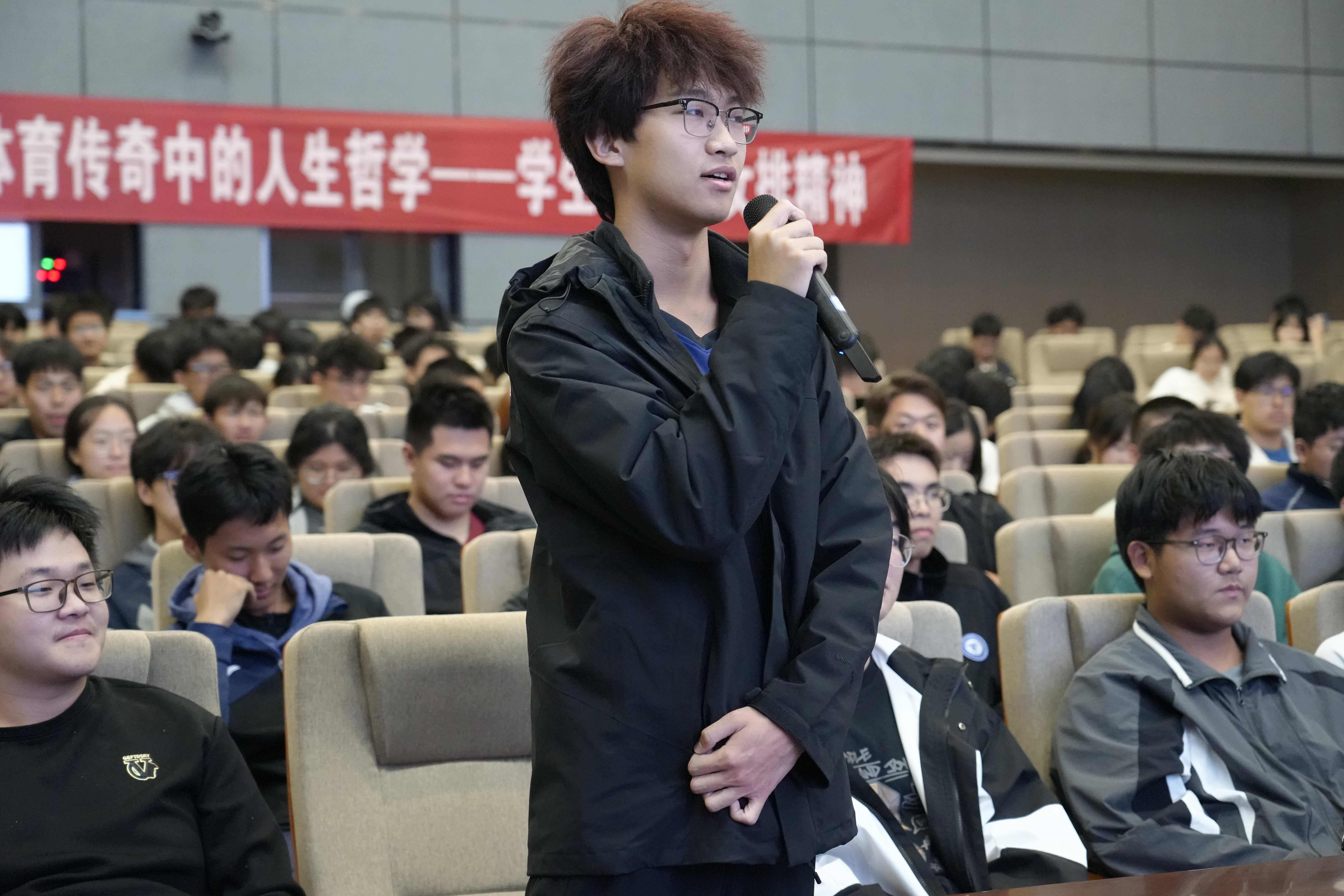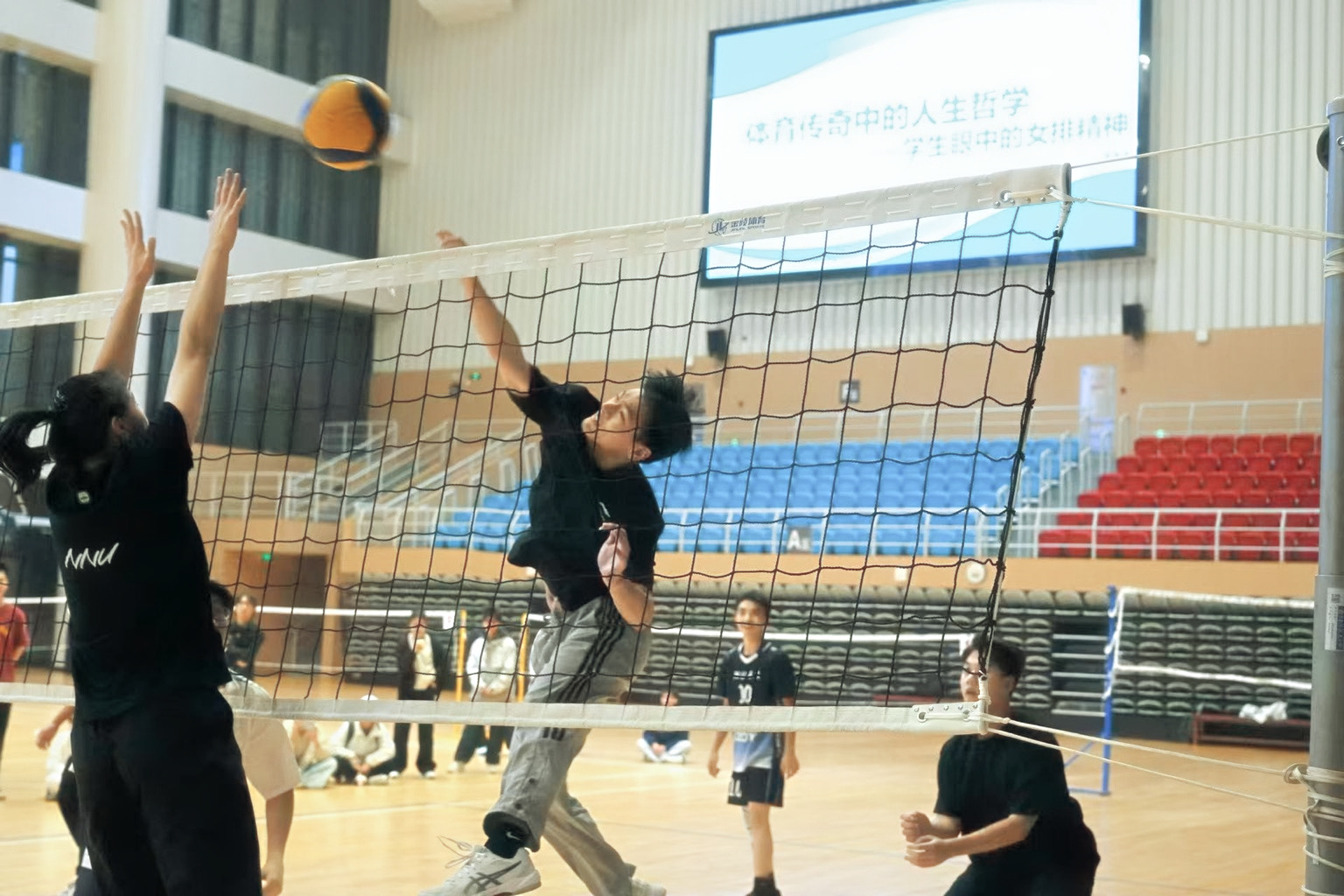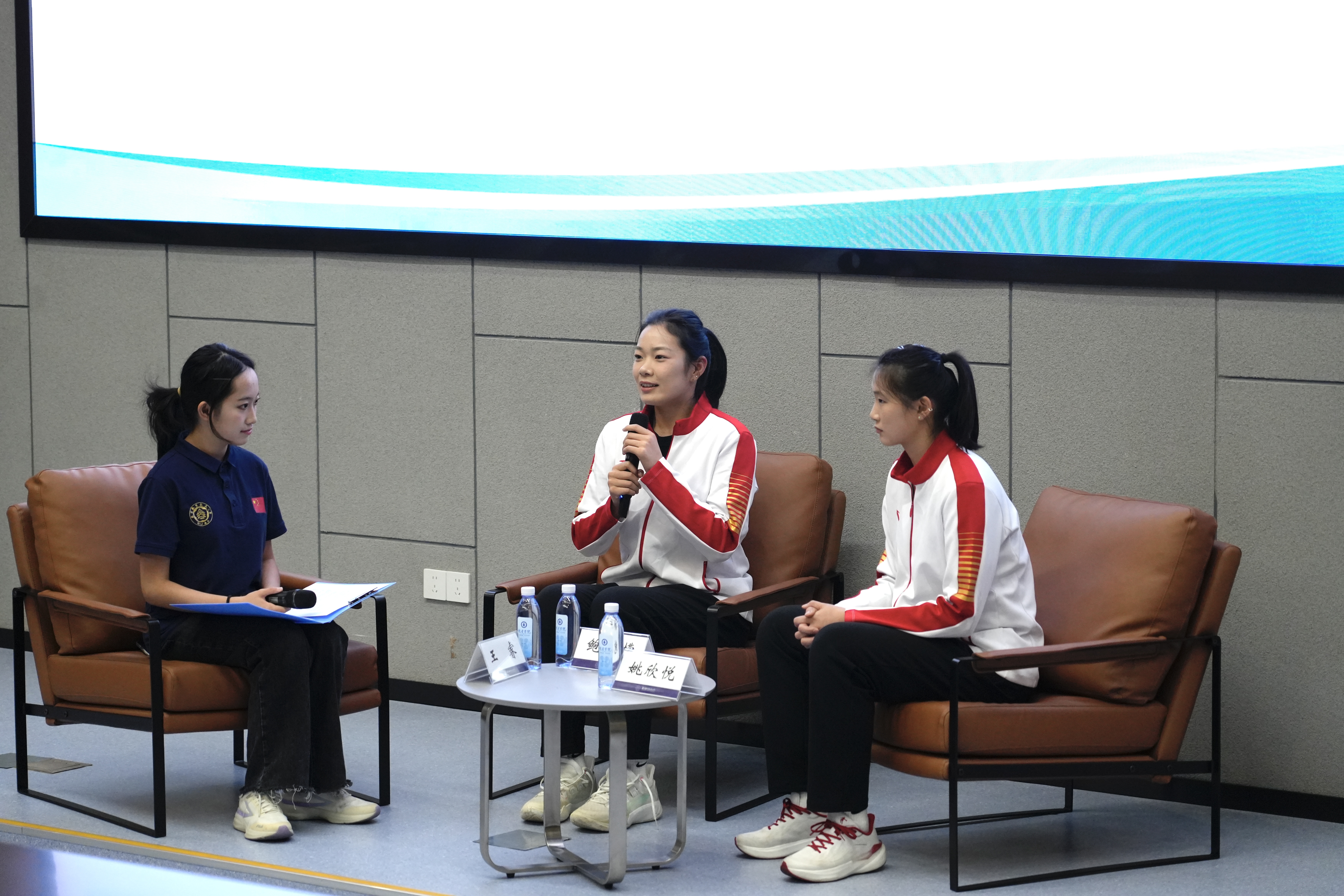 访谈环节气氛热烈,姚欣悦、鲍雨檬分享的运动生涯与心路历程,更是让现场氛围推向高潮。她们在大学生排球联赛中对阵复旦大学的逆转之战,不仅展现了她们精湛的专业技艺,更鲜活诠释了排球运动中“不放弃、不抛弃”的团队精神,现场师生深受触动,掌声经久不息。