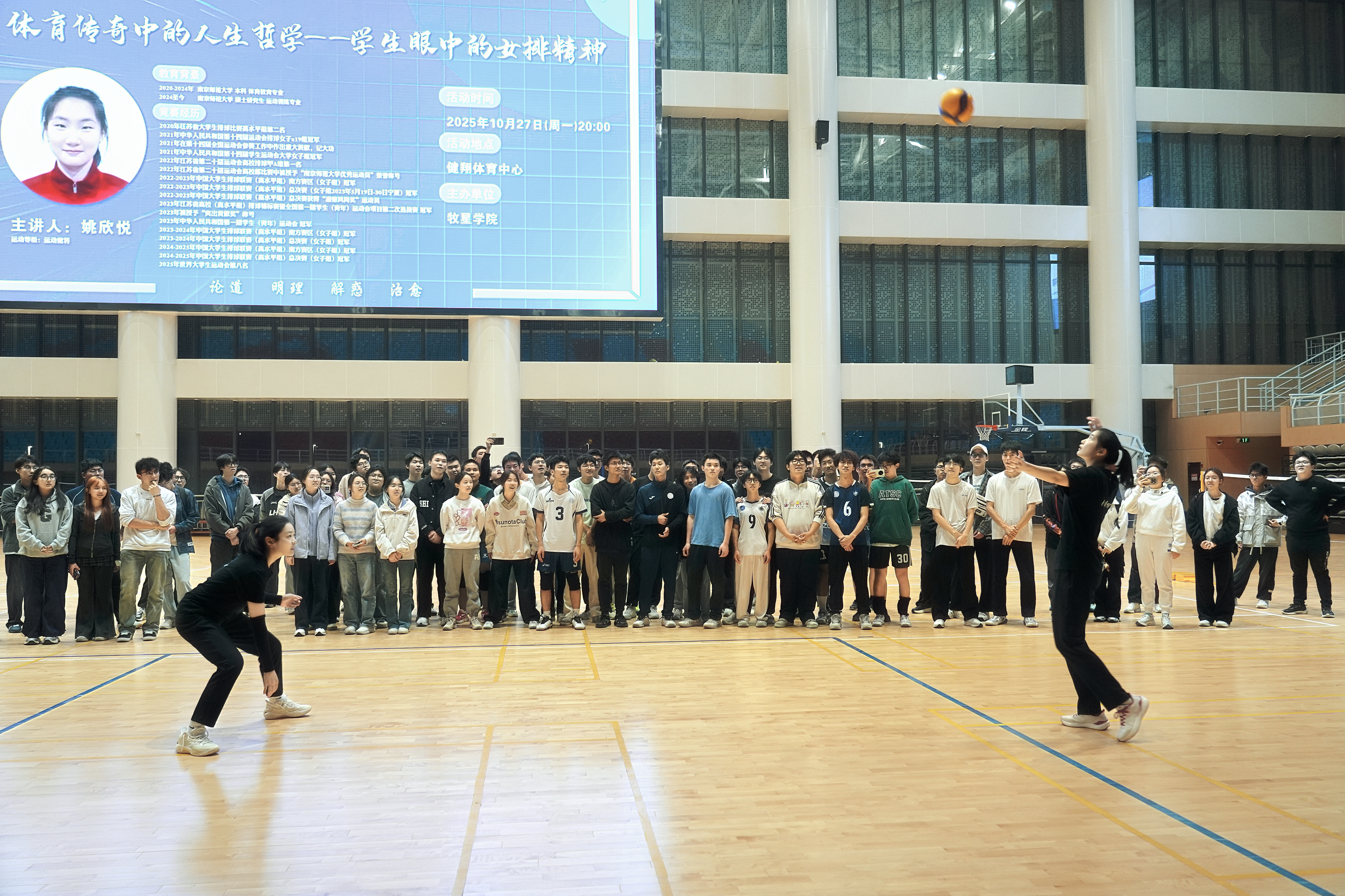 10月27日晚,必威西汉姆联在天目湖校区开展“问致有约·跃动牧星:学生眼中的女排精神”主题活动。本次活动由必威西汉姆联副院长张建辉主讲,特别邀请南京师范大学女排健将姚欣悦、鲍雨檬与校排球队队员及全校100余名排球爱好者齐聚一堂,共赴一场排球与精神的盛宴,深切感受女排精神的磅礴力量。