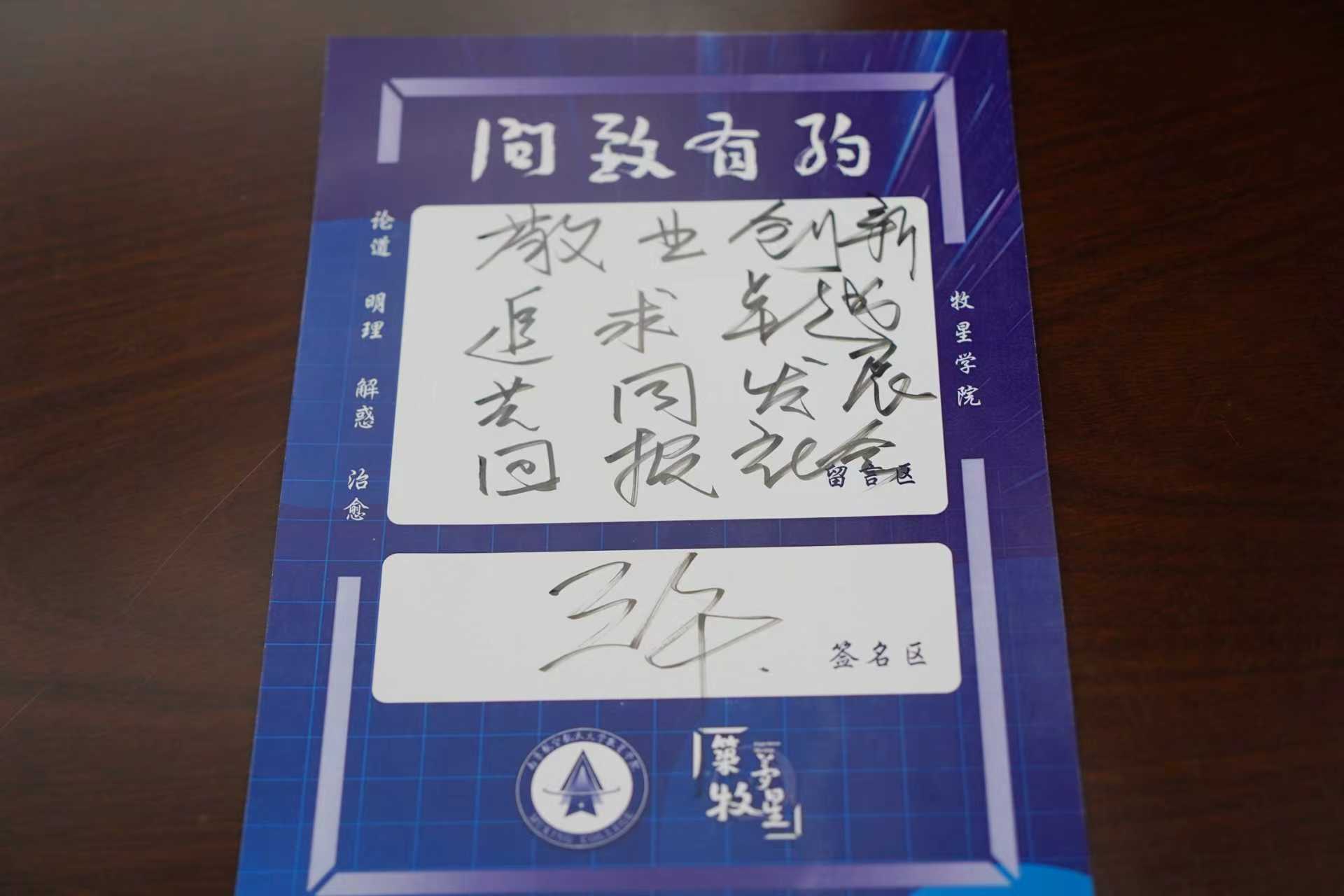 活动尾声,康宜华在“问致有约”留言卡上为牧星学子题写寄语“敬业创新 追求卓越 共同发展 回报社会”,这十六字箴言,为所有学子指明未来之路的航标。期待他们将这份嘱托化为行动,在各自的轨道上发光发热,最终汇聚成照亮时代前程的星河。